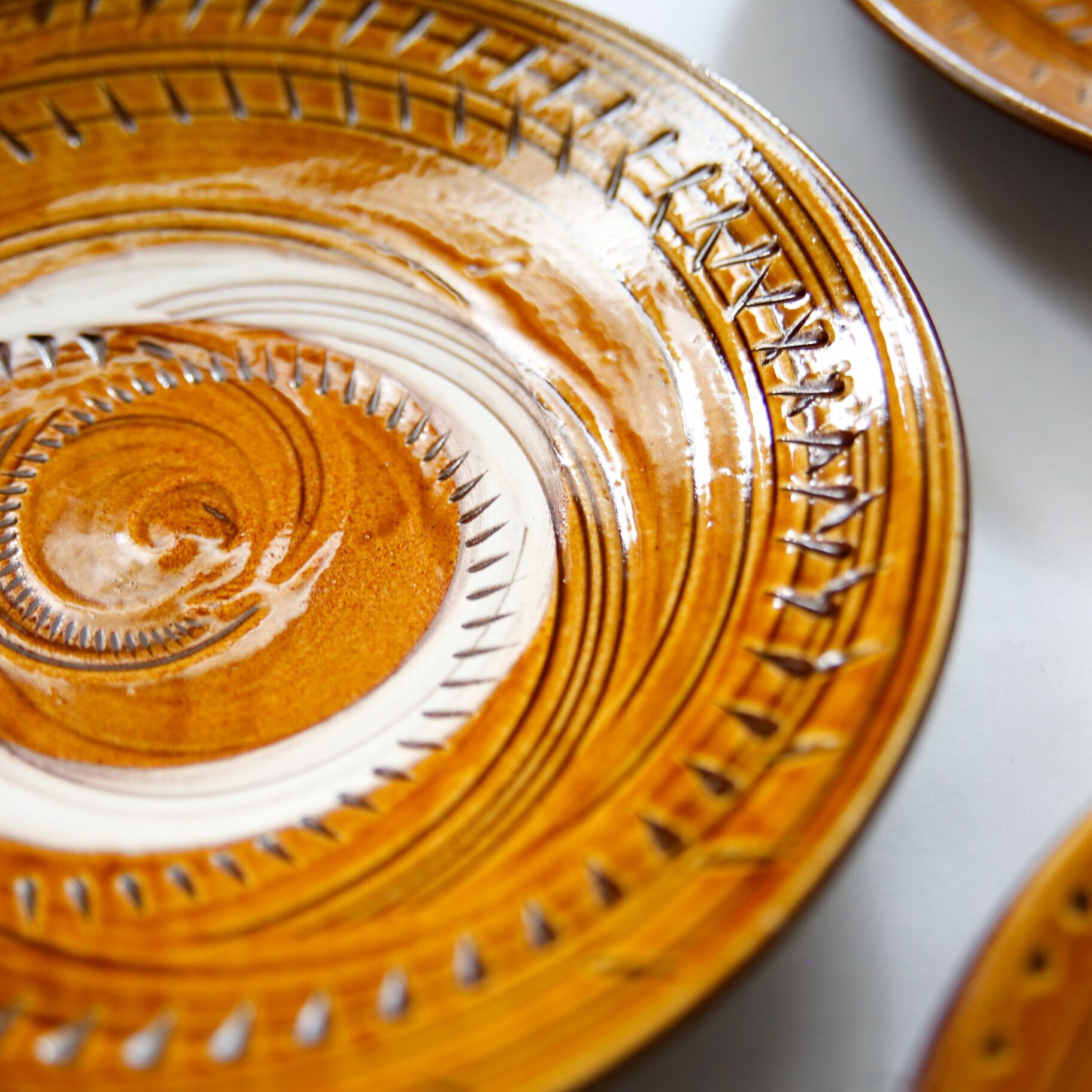小鹿田焼 - 8寸皿 抜き飛び鉋 × 藁引き / 飴 (made in Japan)