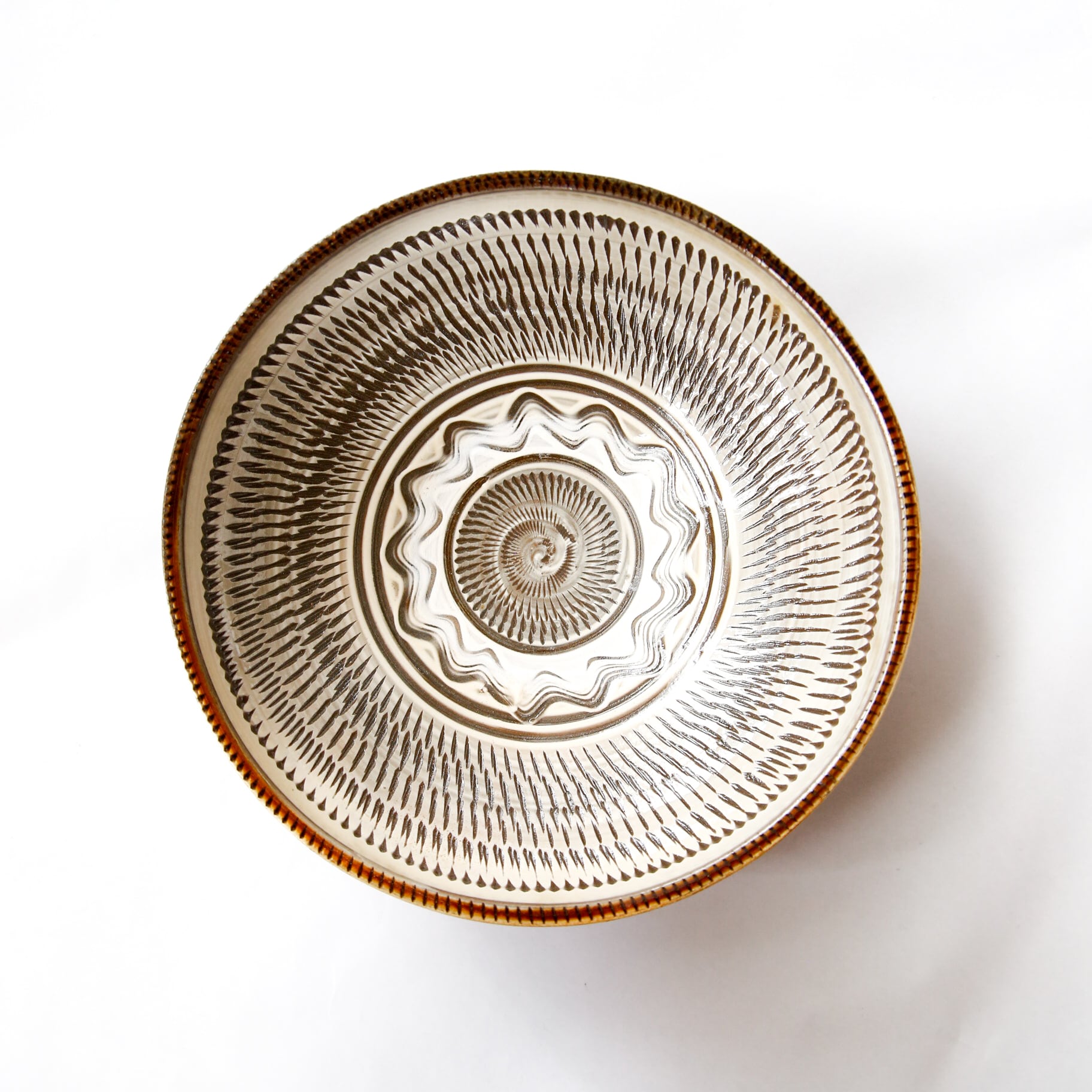 小鹿田焼 - 8寸切り立ち皿 飛び鉋×櫛描き / 白 (made in Japan)