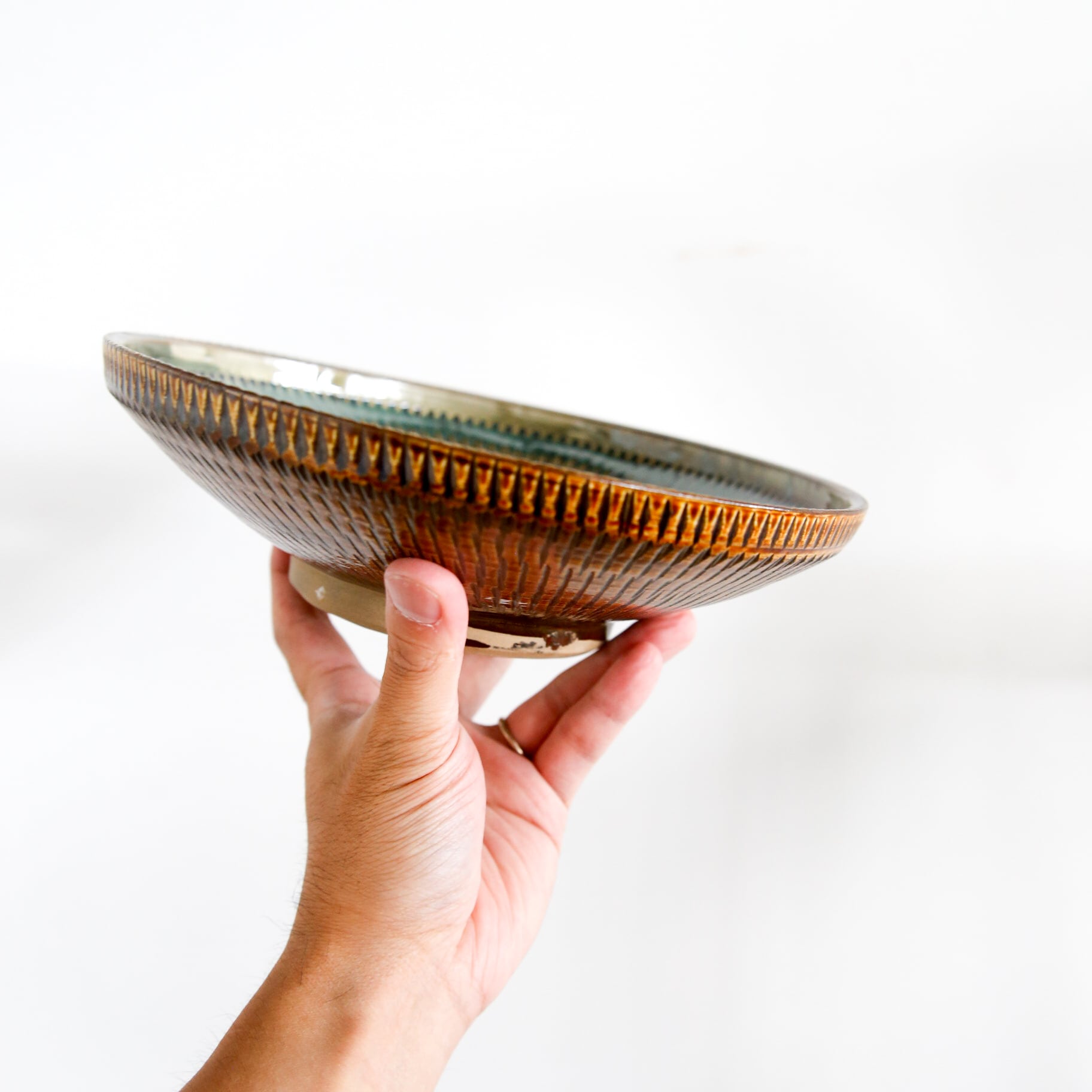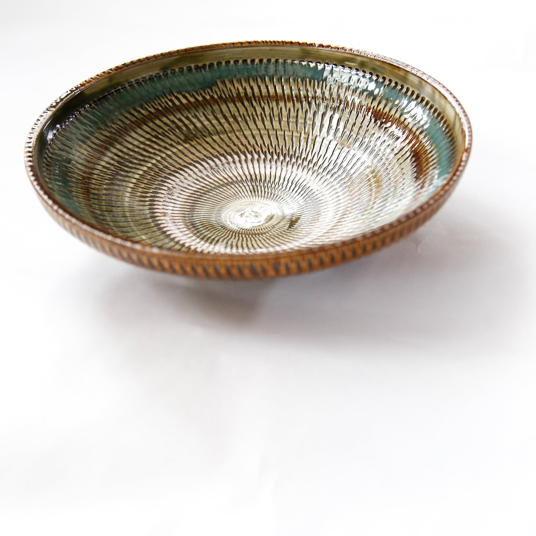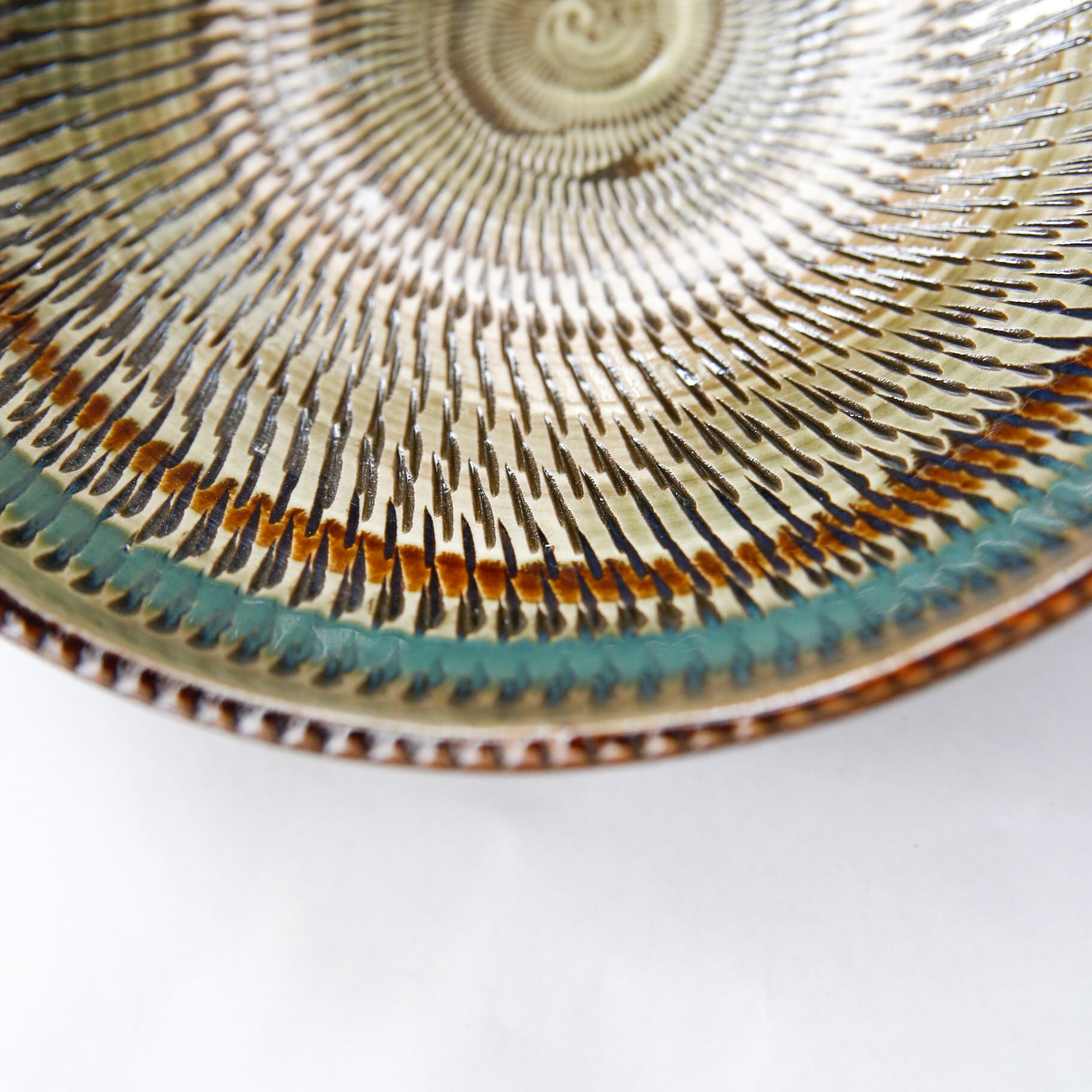 小鹿田焼 - 8寸切り立ち皿 青飴巻飛び鉋 / 緑 (made in Japan)