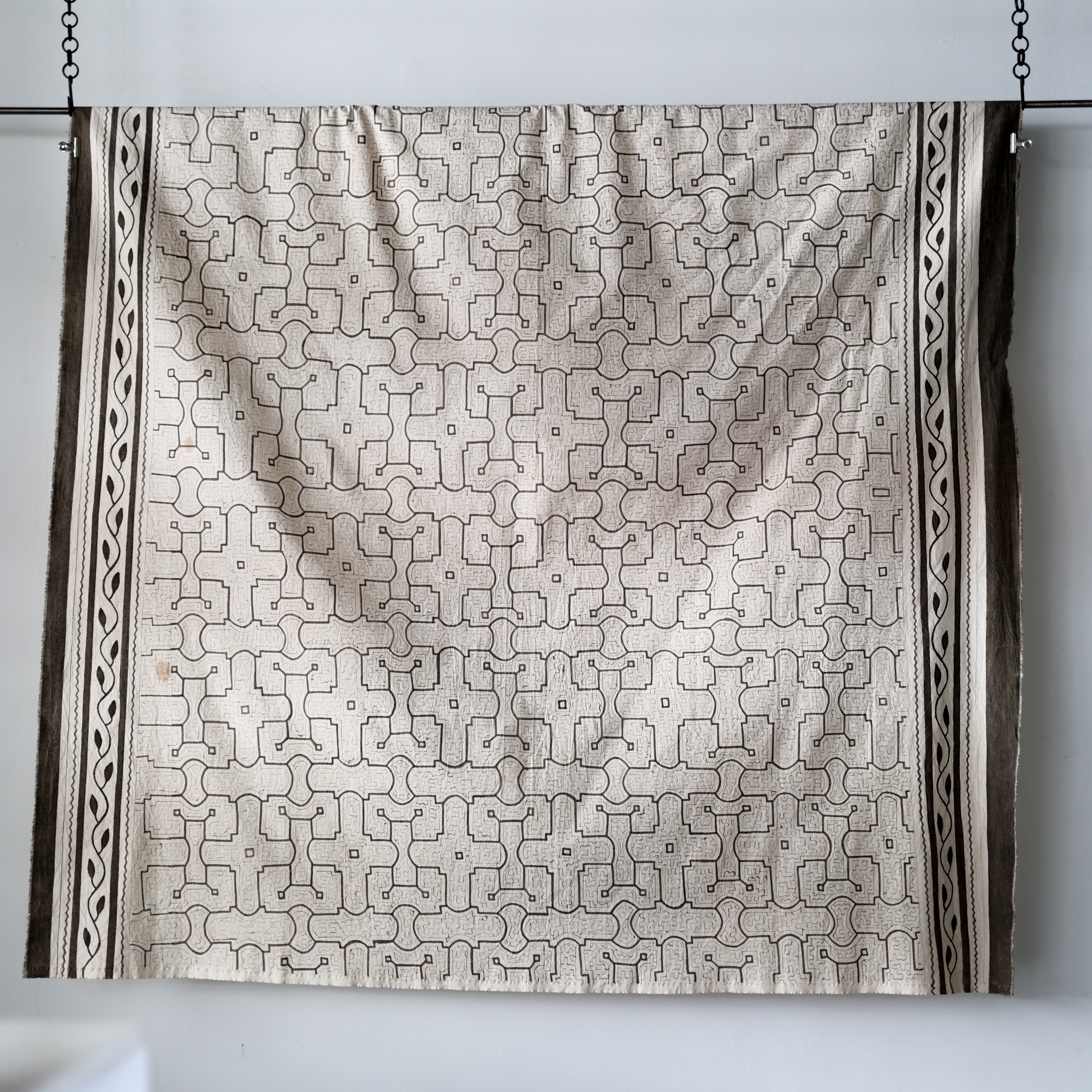 正確には、樹皮を煮出して作る染料にて柄を描き(この時は茶色)