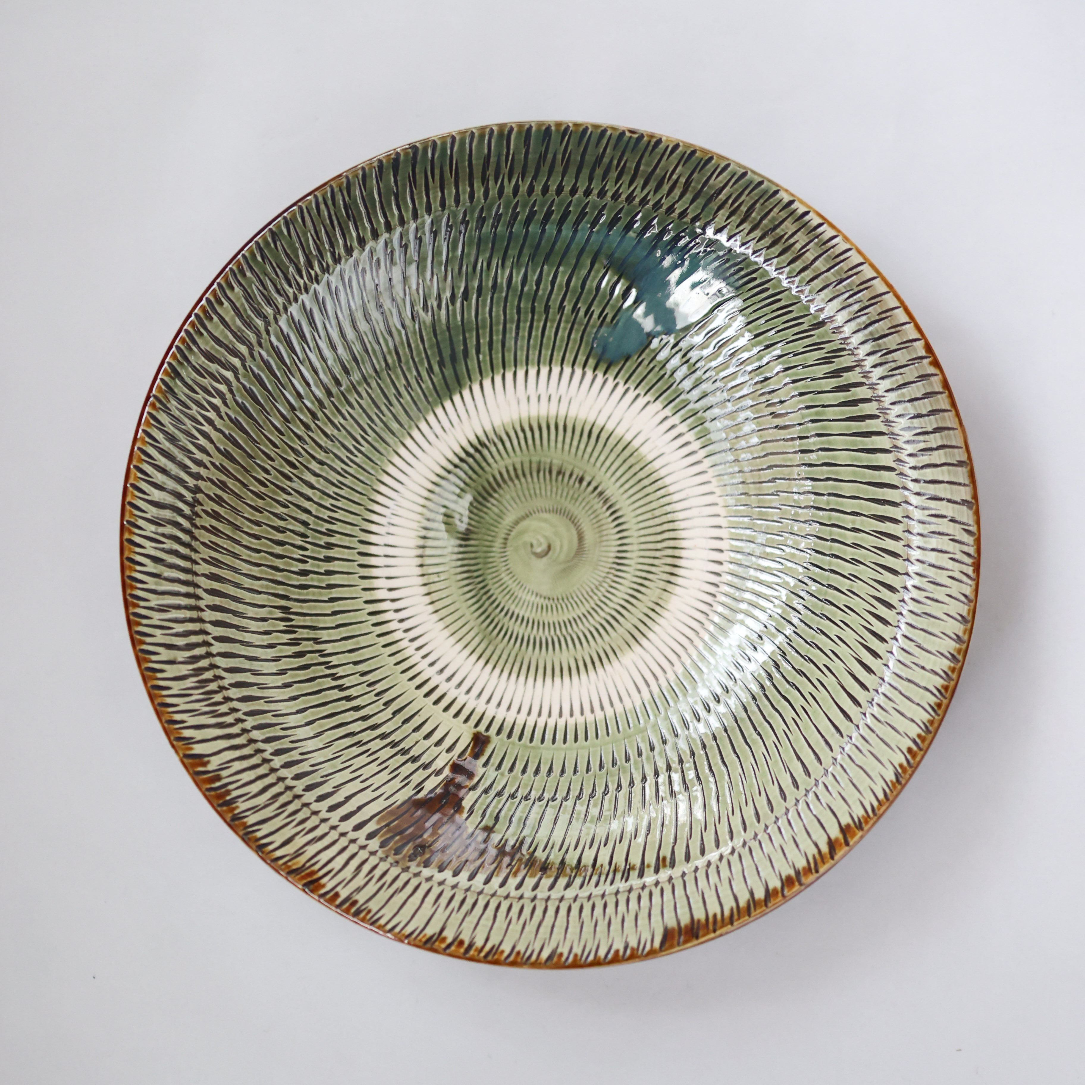 小鹿田焼 - 尺皿 飛び鉋 × 打ち掛け / 緑 (made in Japan)