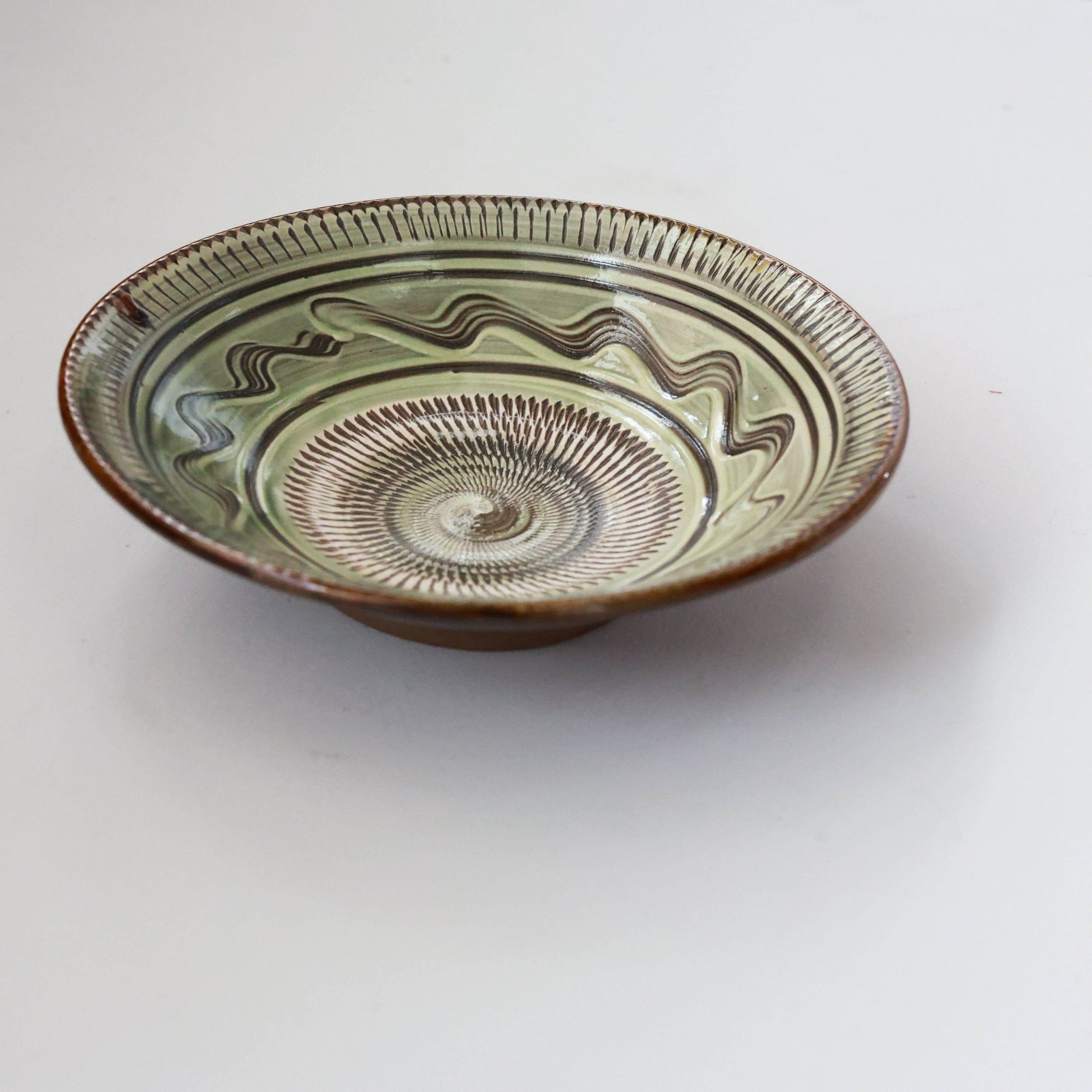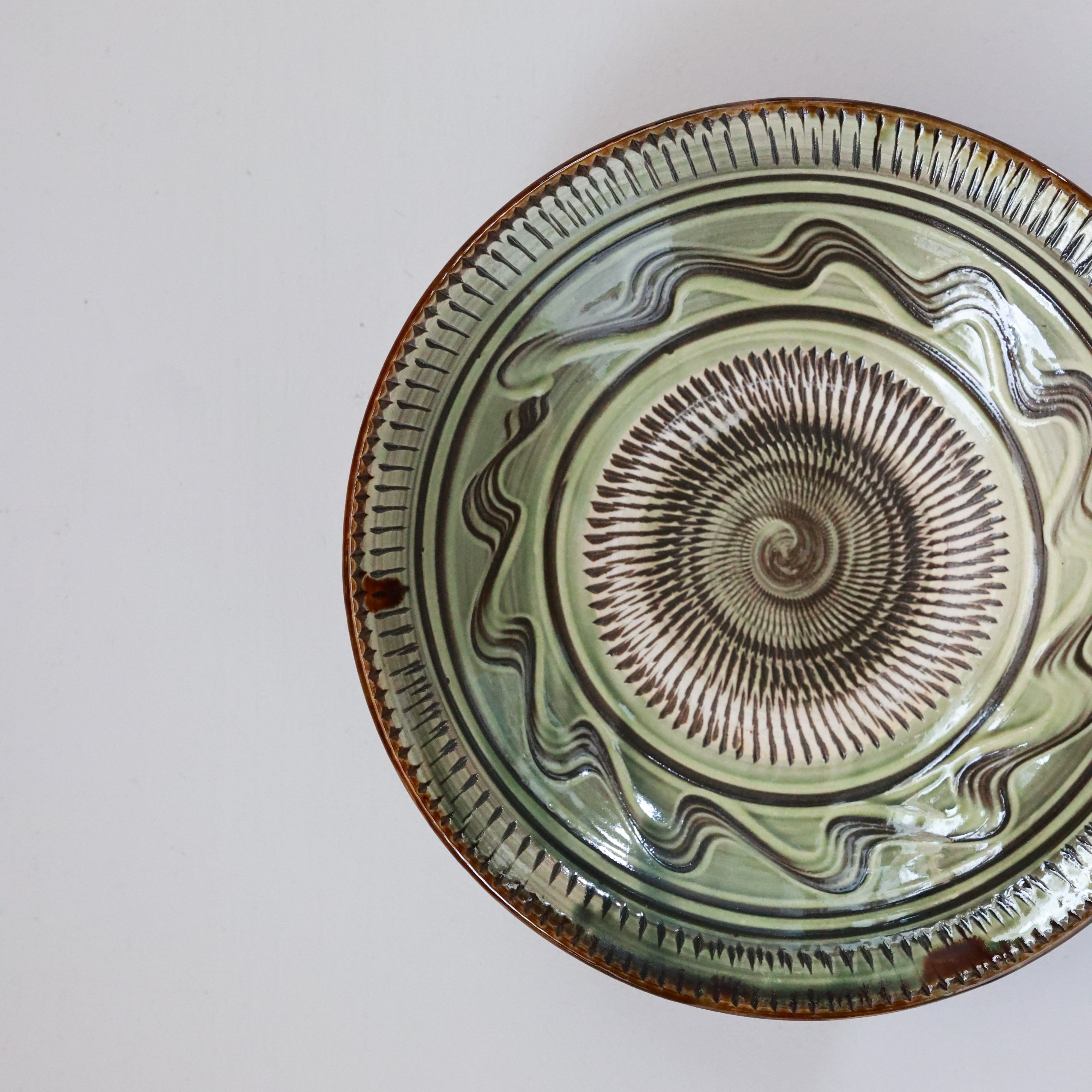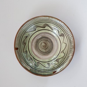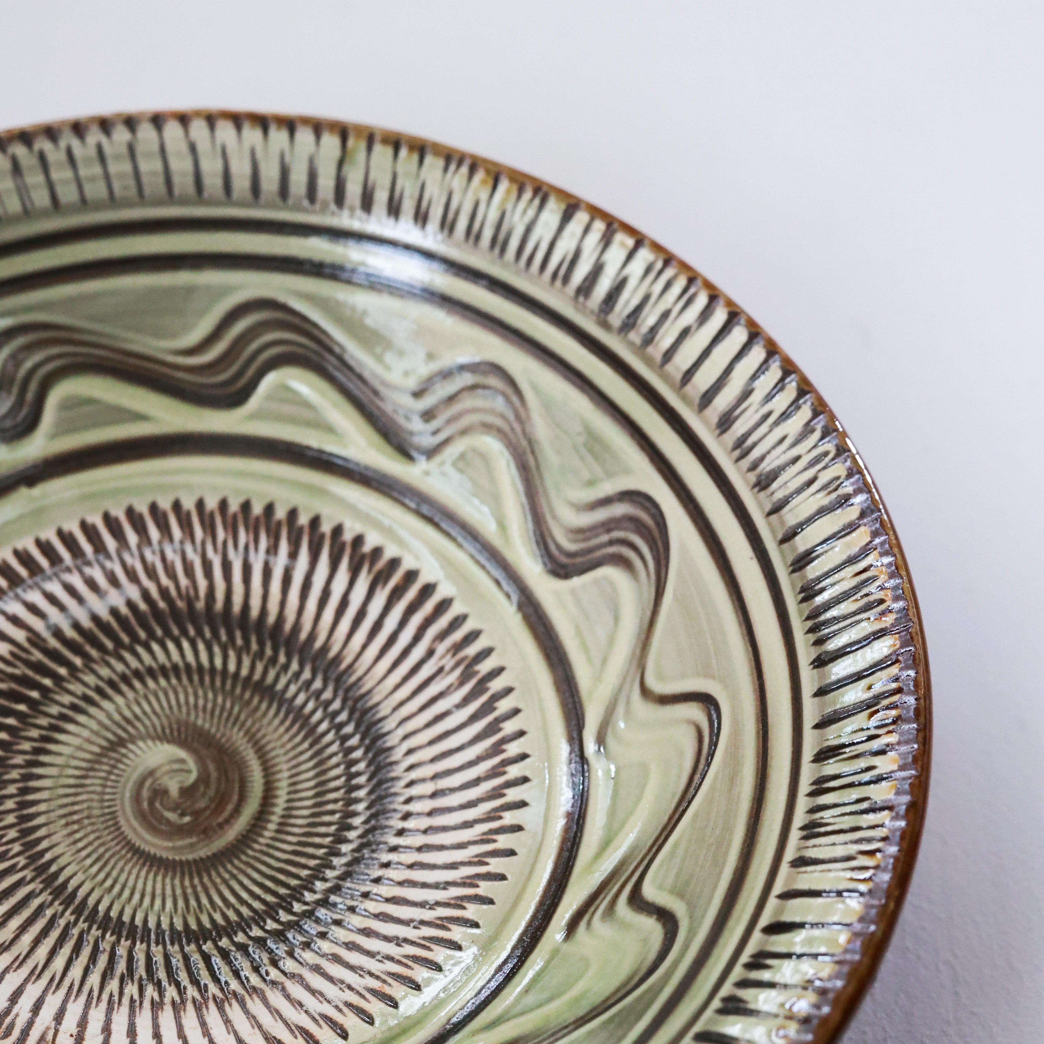 小鹿田焼 - 7寸深皿 飛び鉋 × イッチン / 緑 (made in Japan)