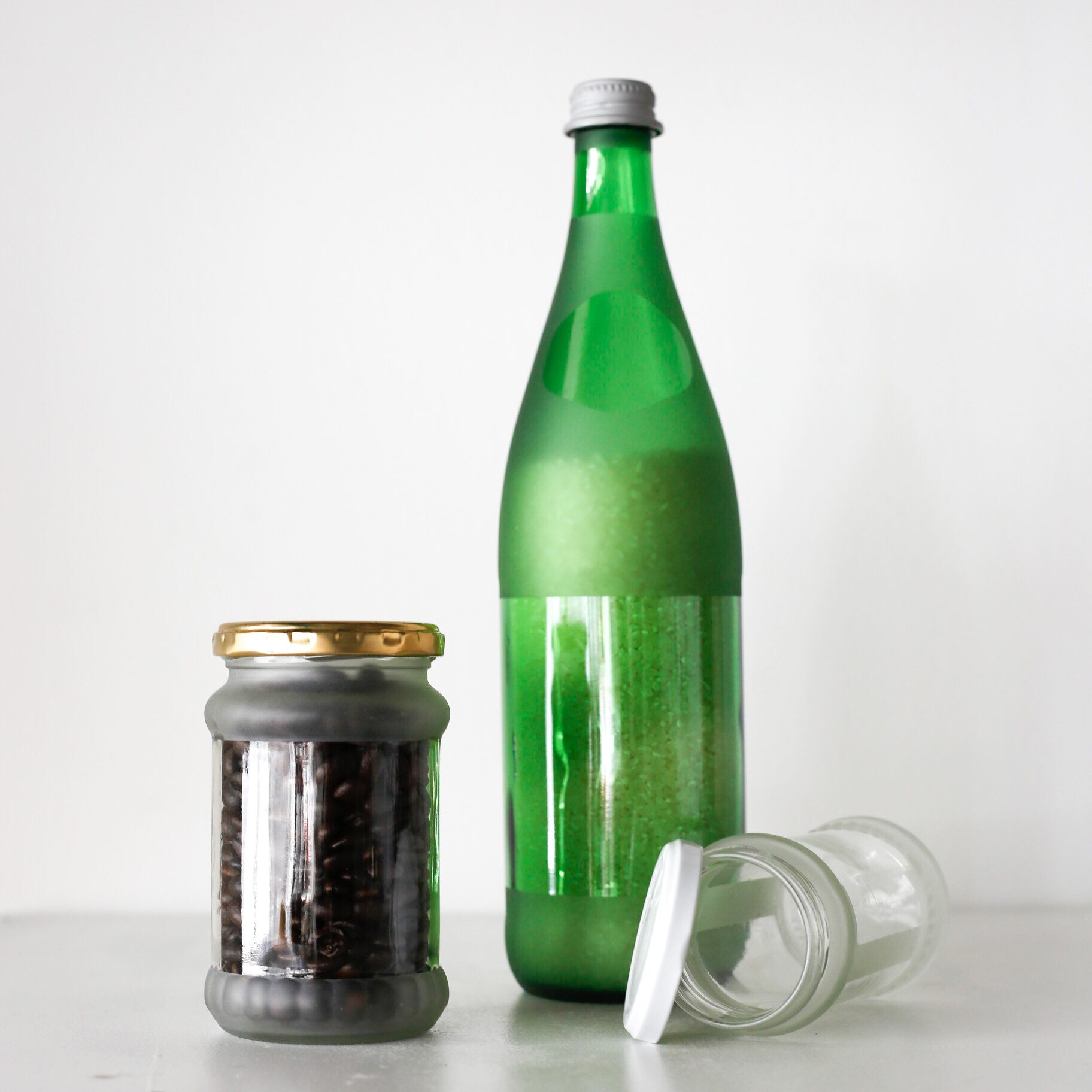 サイズも大小様々、元々は食品や飲料が入っていた容器を使用しているので